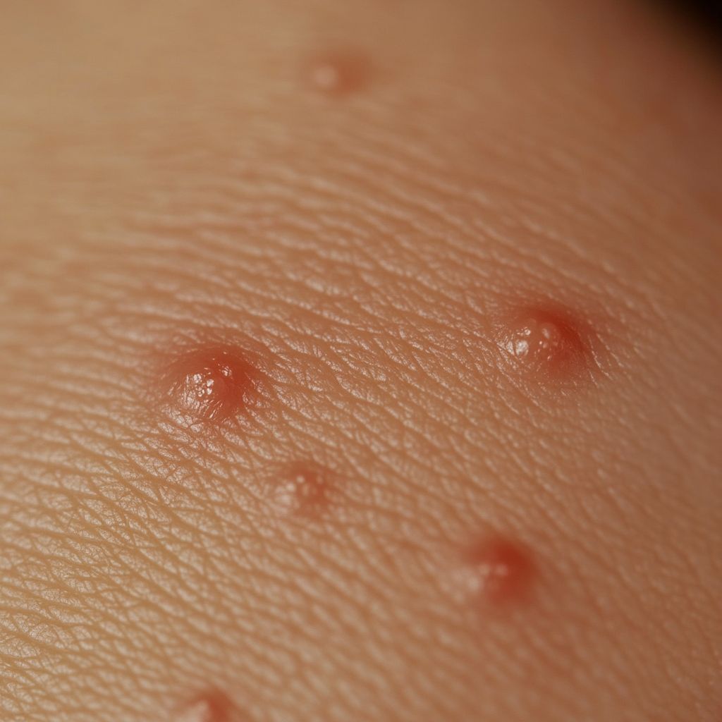 Bettwanzenbiss: Bettwanzen hinterlassen meist eine Reihe von Bissen auf unbedeckter Haut (Arme, Hals, Gesicht). Die Bisse erscheinen als rote, geschwollene Stellen mit leichtem Juckreiz, der sich über Stunden oder Tage verstärken kann.
