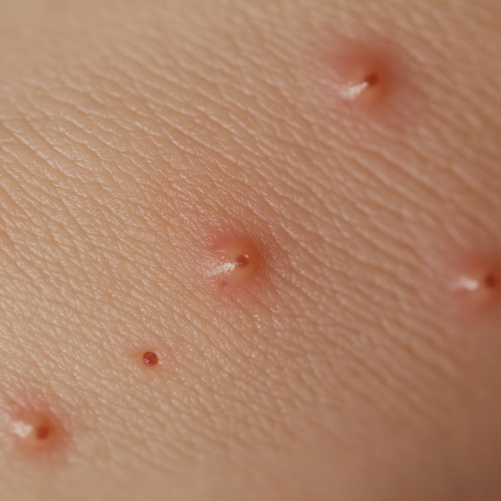 Mückenstich: Mückenstiche verursachen sofortige Schwellungen mit einem roten Punkt in der Mitte. Der Juckreiz tritt schnell ein, ist aber meist nur kurzzeitig. Mückenstiche sind einzeln und nicht in Gruppen angeordnet.