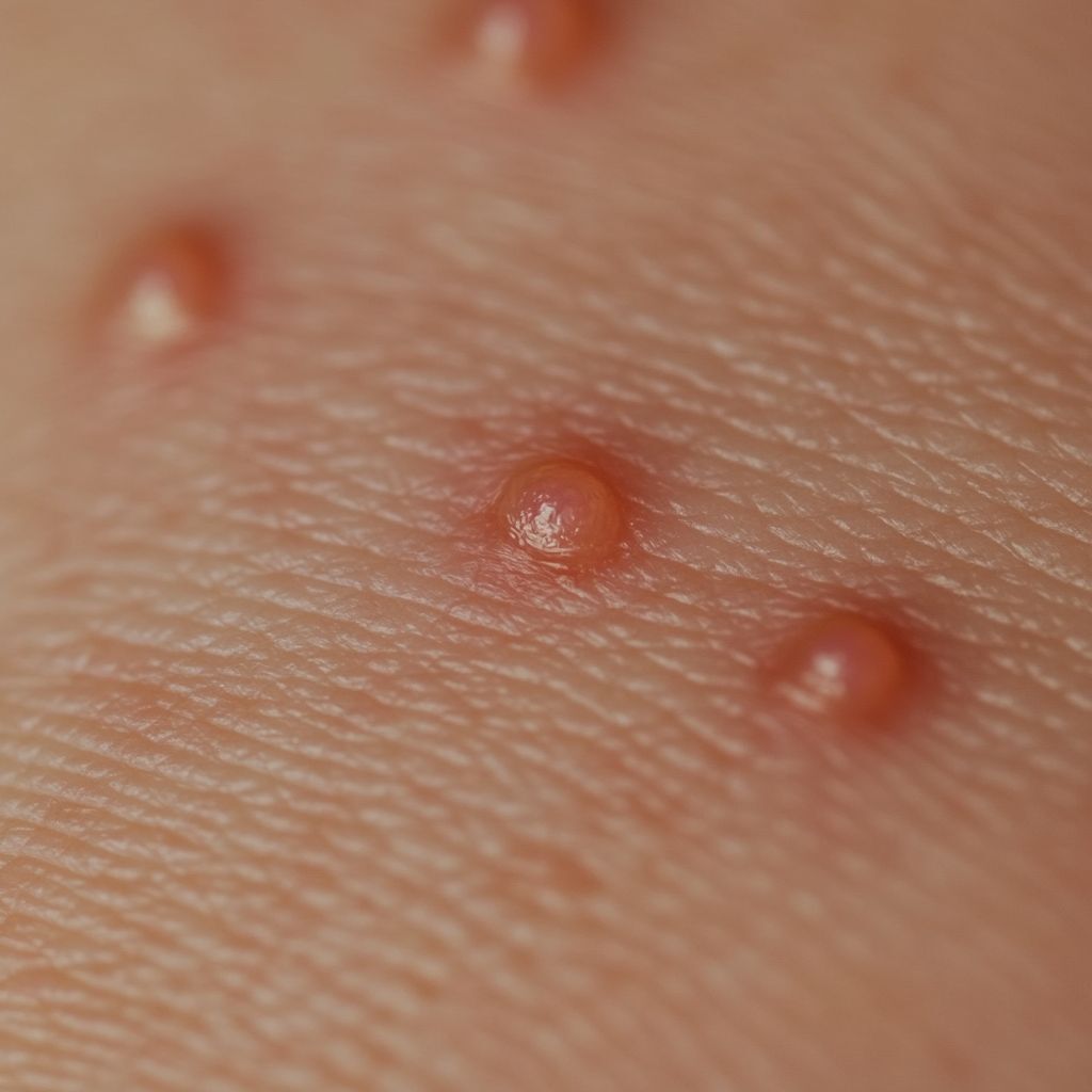 Flohbiss: Flöhe beissen oft in Gruppen oder Reihen, besonders an den Beinen, Knöcheln und Füssen. Die Bisse sind klein, rot und verursachen intensiven Juckreiz. Sie können sekundäre Infektionen hervorrufen, wenn sie aufgekratzt werden.