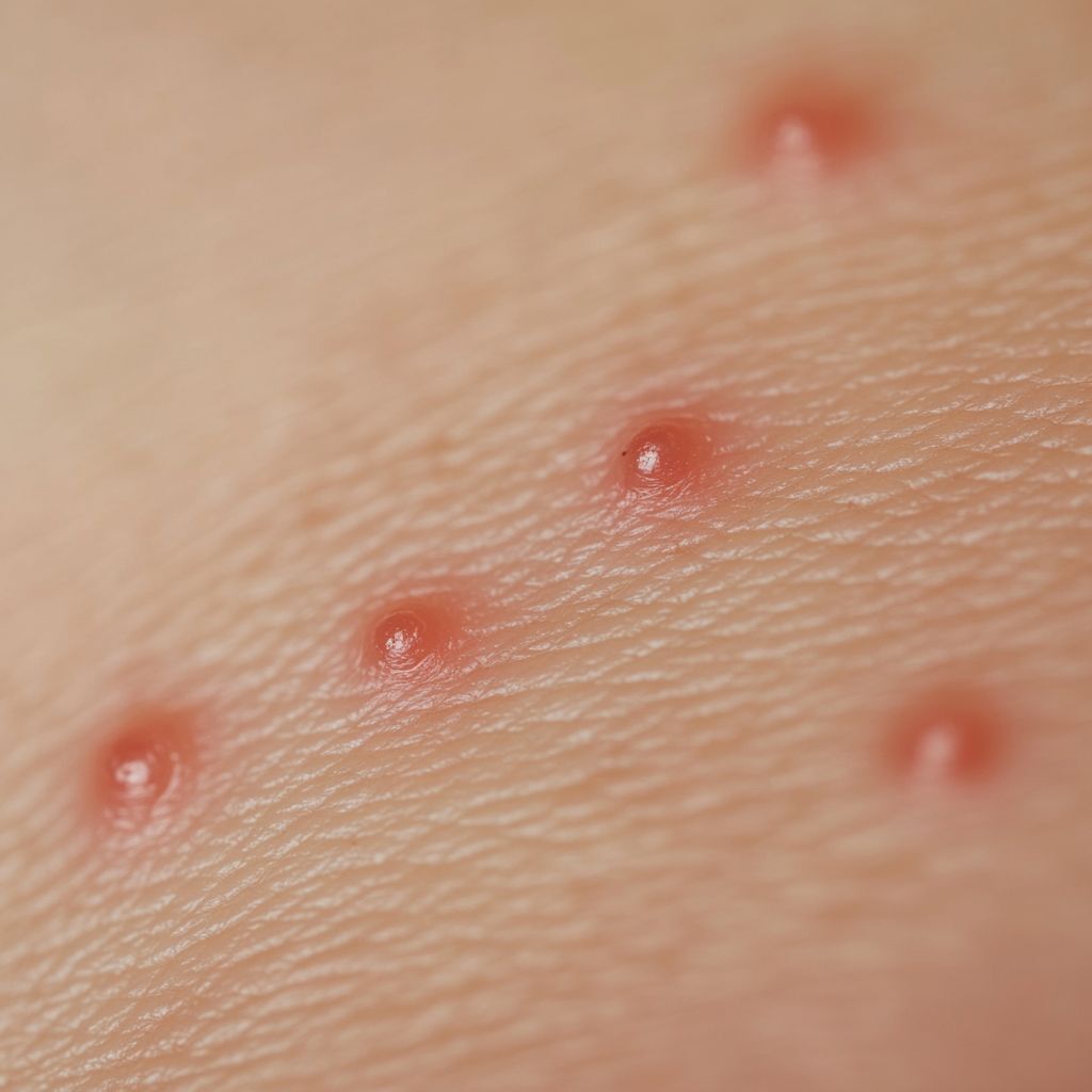 Mückenstich: Mückenstiche verursachen sofortige Schwellungen mit einem roten Punkt in der Mitte. Der Juckreiz tritt schnell ein, ist aber meist nur kurzzeitig. Mückenstiche sind einzeln und nicht in Gruppen angeordnet.