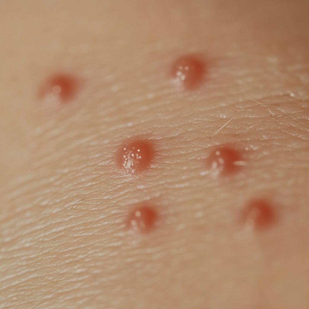 Mückenstich: Mückenstiche verursachen sofortige Schwellungen mit einem roten Punkt in der Mitte. Der Juckreiz tritt schnell ein, ist aber meist nur kurzzeitig. Mückenstiche sind einzeln und nicht in Gruppen angeordnet.
