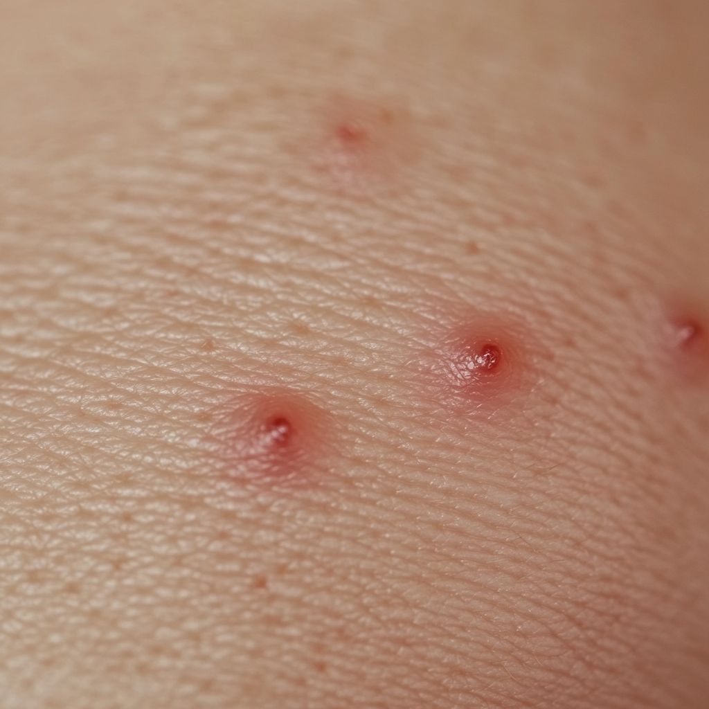 Flohbiss: Flöhe beissen oft in Gruppen oder Reihen, besonders an den Beinen, Knöcheln und Füssen. Die Bisse sind klein, rot und verursachen intensiven Juckreiz. Sie können sekundäre Infektionen hervorrufen, wenn sie aufgekratzt werden.