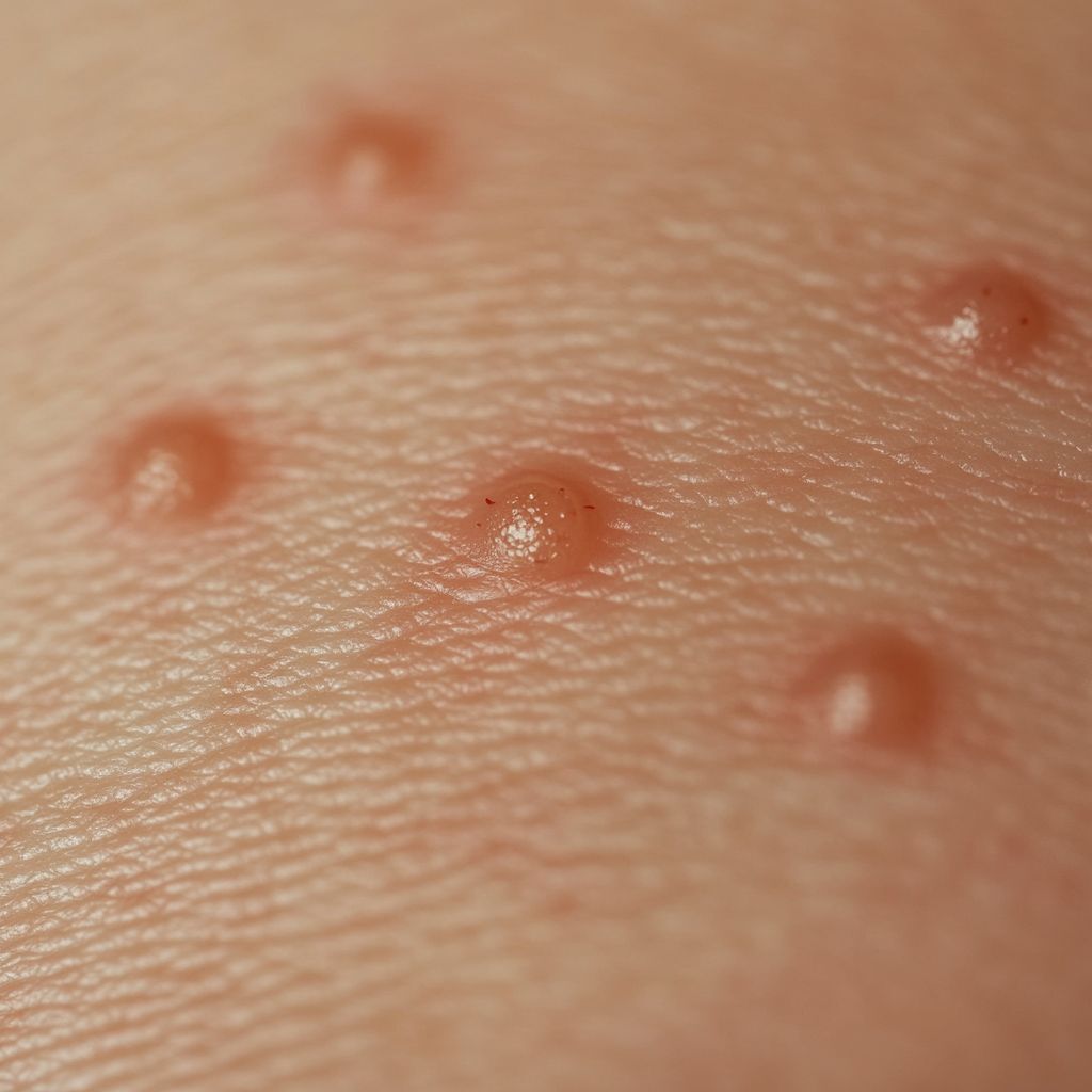 Flohbiss: Flöhe beissen oft in Gruppen oder Reihen, besonders an den Beinen, Knöcheln und Füssen. Die Bisse sind klein, rot und verursachen intensiven Juckreiz. Sie können sekundäre Infektionen hervorrufen, wenn sie aufgekratzt werden.