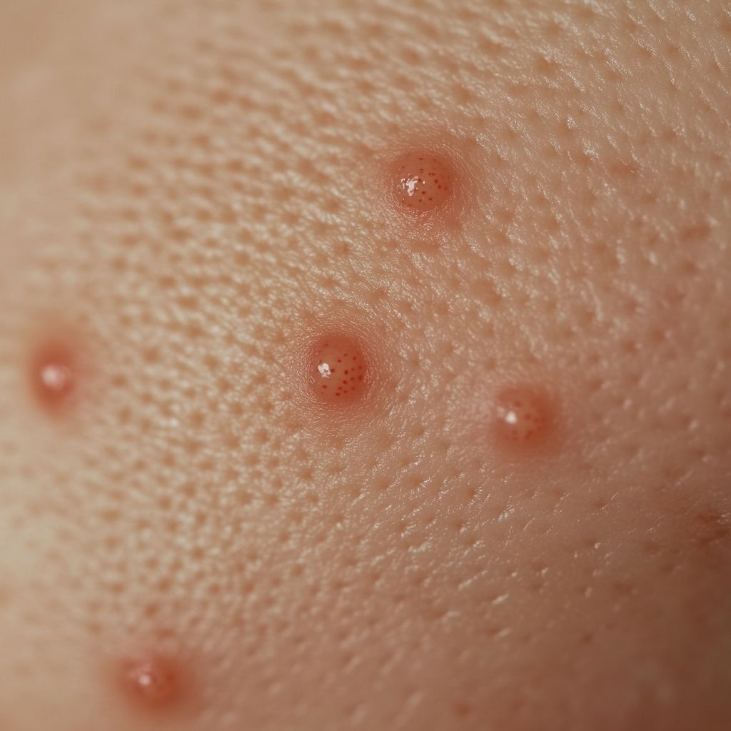 Flohbiss: Flöhe beissen oft in Gruppen oder Reihen, besonders an den Beinen, Knöcheln und Füssen. Die Bisse sind klein, rot und verursachen intensiven Juckreiz. Sie können sekundäre Infektionen hervorrufen, wenn sie aufgekratzt werden.