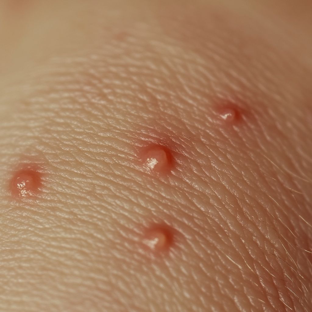 Mückenstich: Mückenstiche verursachen sofortige Schwellungen mit einem roten Punkt in der Mitte. Der Juckreiz tritt schnell ein, ist aber meist nur kurzzeitig. Mückenstiche sind einzeln und nicht in Gruppen angeordnet.