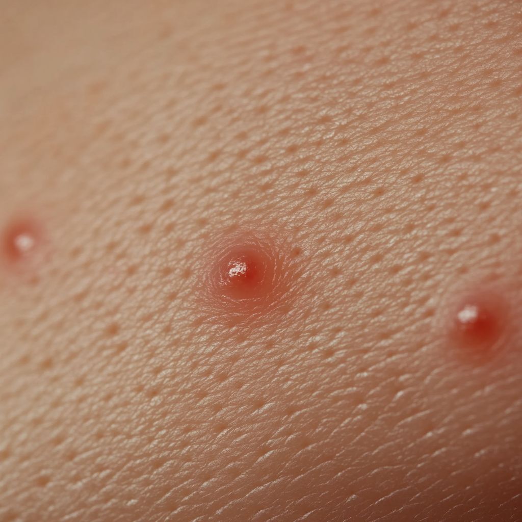 Flohbiss: Flöhe beissen oft in Gruppen oder Reihen, besonders an den Beinen, Knöcheln und Füssen. Die Bisse sind klein, rot und verursachen intensiven Juckreiz. Sie können sekundäre Infektionen hervorrufen, wenn sie aufgekratzt werden.