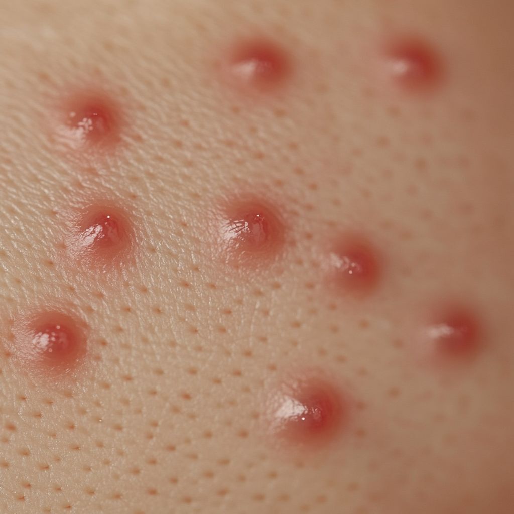 Flohbiss: Flöhe beissen oft in Gruppen oder Reihen, besonders an den Beinen, Knöcheln und Füssen. Die Bisse sind klein, rot und verursachen intensiven Juckreiz. Sie können sekundäre Infektionen hervorrufen, wenn sie aufgekratzt werden.