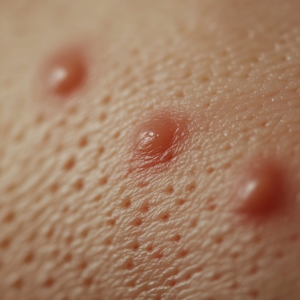 Flohbiss: Flöhe beissen oft in Gruppen oder Reihen, besonders an den Beinen, Knöcheln und Füssen. Die Bisse sind klein, rot und verursachen intensiven Juckreiz. Sie können sekundäre Infektionen hervorrufen, wenn sie aufgekratzt werden.