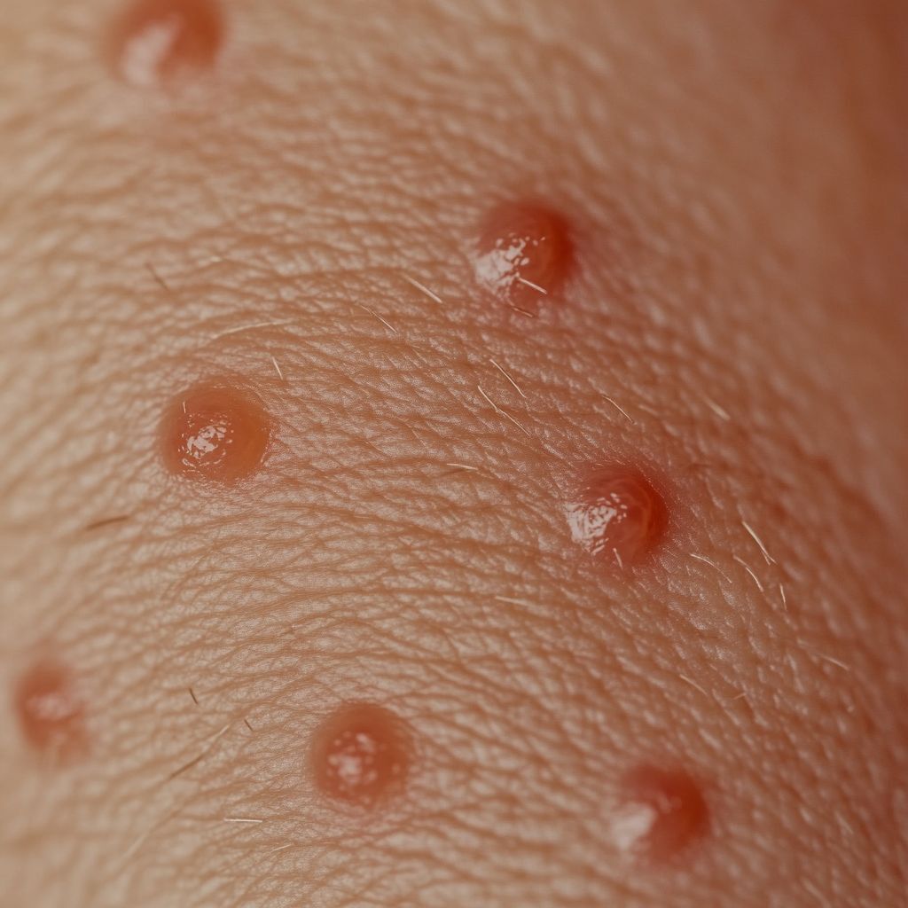 Flohbiss: Flöhe beissen oft in Gruppen oder Reihen, besonders an den Beinen, Knöcheln und Füssen. Die Bisse sind klein, rot und verursachen intensiven Juckreiz. Sie können sekundäre Infektionen hervorrufen, wenn sie aufgekratzt werden.