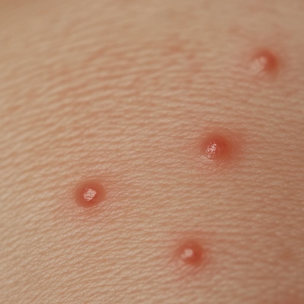 Mückenstich: Mückenstiche verursachen sofortige Schwellungen mit einem roten Punkt in der Mitte. Der Juckreiz tritt schnell ein, ist aber meist nur kurzzeitig. Mückenstiche sind einzeln und nicht in Gruppen angeordnet.