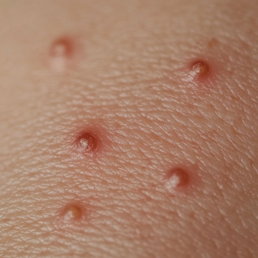 Mückenstich: Mückenstiche verursachen sofortige Schwellungen mit einem roten Punkt in der Mitte. Der Juckreiz tritt schnell ein, ist aber meist nur kurzzeitig. Mückenstiche sind einzeln und nicht in Gruppen angeordnet.