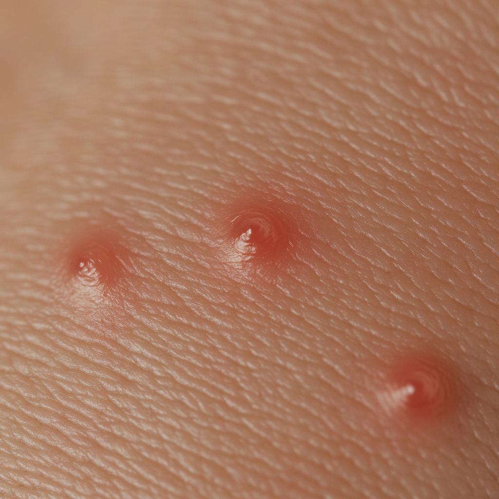 Flohbiss: Flöhe beissen oft in Gruppen oder Reihen, besonders an den Beinen, Knöcheln und Füssen. Die Bisse sind klein, rot und verursachen intensiven Juckreiz. Sie können sekundäre Infektionen hervorrufen, wenn sie aufgekratzt werden.