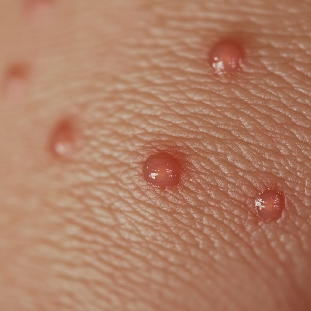 Flohbiss: Flöhe beissen oft in Gruppen oder Reihen, besonders an den Beinen, Knöcheln und Füssen. Die Bisse sind klein, rot und verursachen intensiven Juckreiz. Sie können sekundäre Infektionen hervorrufen, wenn sie aufgekratzt werden.