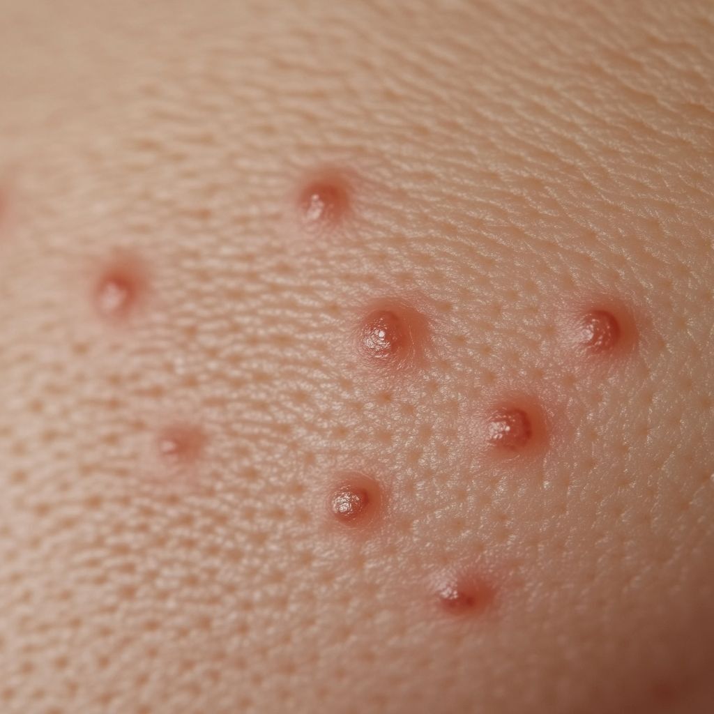 Flohbiss: Flöhe beissen oft in Gruppen oder Reihen, besonders an den Beinen, Knöcheln und Füssen. Die Bisse sind klein, rot und verursachen intensiven Juckreiz. Sie können sekundäre Infektionen hervorrufen, wenn sie aufgekratzt werden.