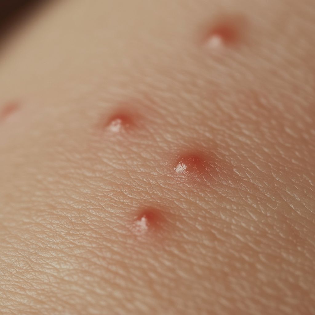 Flohbiss: Flöhe beissen oft in Gruppen oder Reihen, besonders an den Beinen, Knöcheln und Füssen. Die Bisse sind klein, rot und verursachen intensiven Juckreiz. Sie können sekundäre Infektionen hervorrufen, wenn sie aufgekratzt werden.
