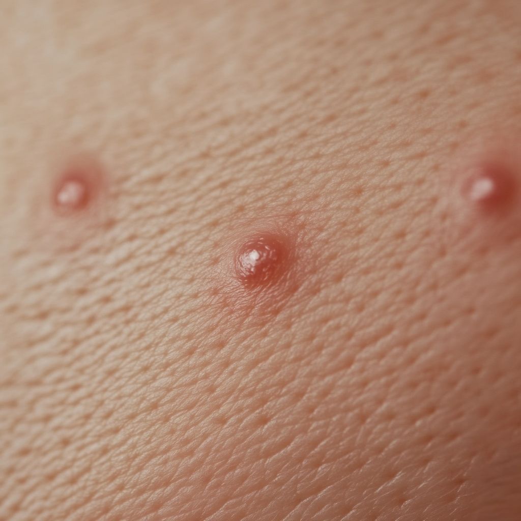 Flohbiss: Flöhe beissen oft in Gruppen oder Reihen, besonders an den Beinen, Knöcheln und Füssen. Die Bisse sind klein, rot und verursachen intensiven Juckreiz. Sie können sekundäre Infektionen hervorrufen, wenn sie aufgekratzt werden.