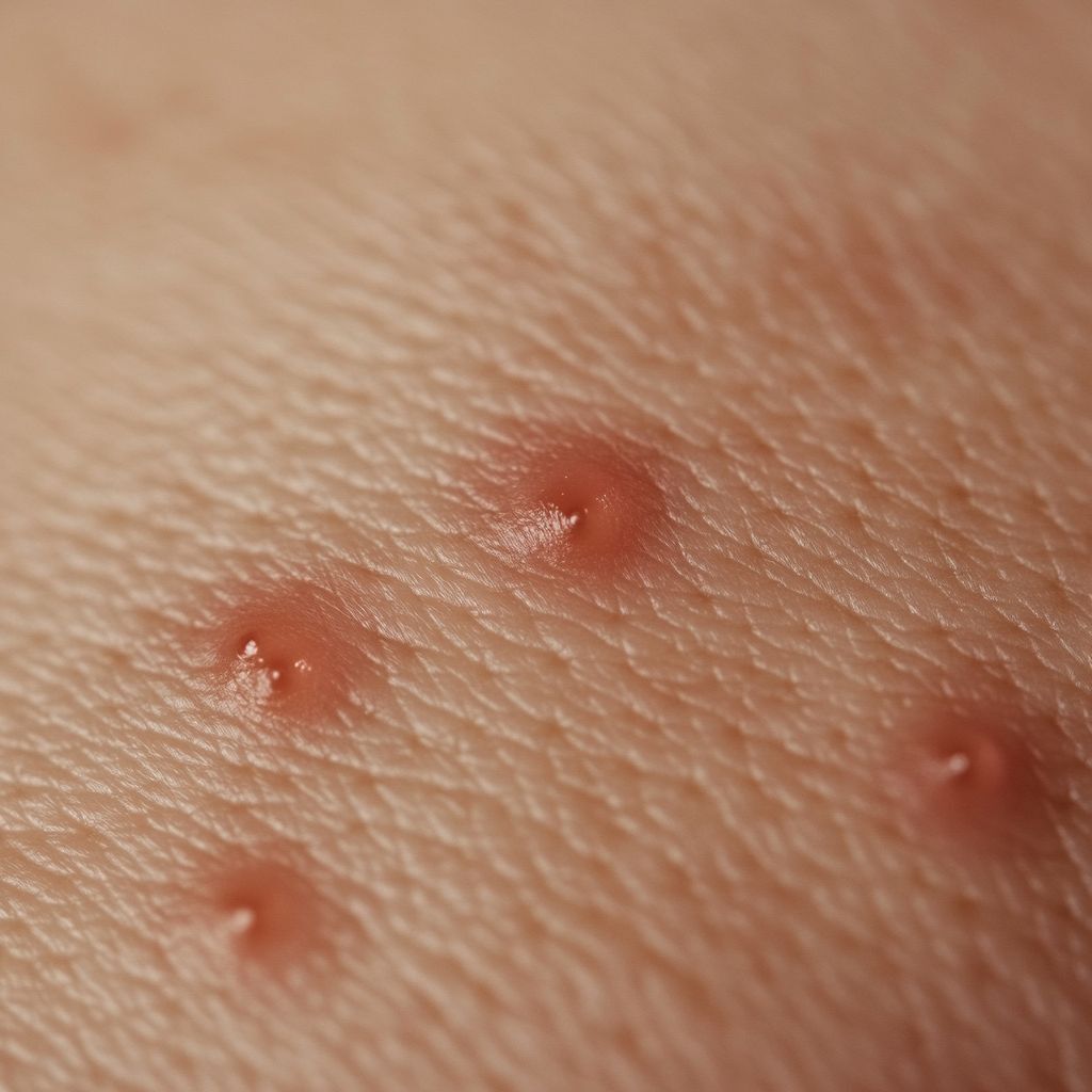 Bettwanzenbiss: Bettwanzen hinterlassen meist eine Reihe von Bissen auf unbedeckter Haut (Arme, Hals, Gesicht). Die Bisse erscheinen als rote, geschwollene Stellen mit leichtem Juckreiz, der sich über Stunden oder Tage verstärken kann.