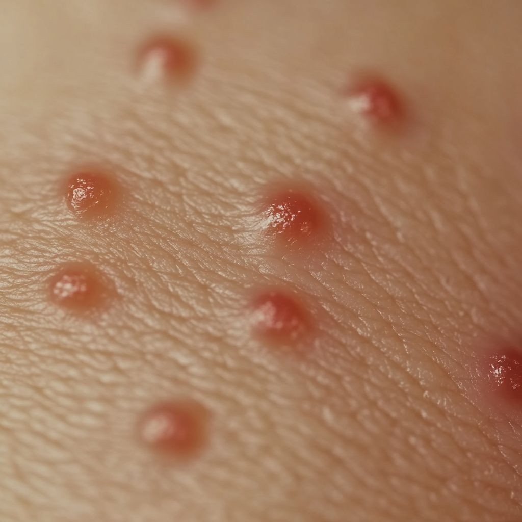 Bettwanzenbiss: Bettwanzen hinterlassen meist eine Reihe von Bissen auf unbedeckter Haut (Arme, Hals, Gesicht). Die Bisse erscheinen als rote, geschwollene Stellen mit leichtem Juckreiz, der sich über Stunden oder Tage verstärken kann.