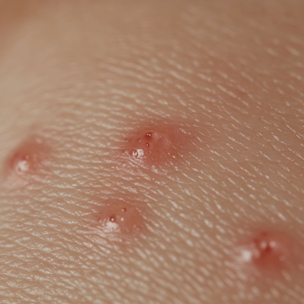 Flohbiss: Flöhe beissen oft in Gruppen oder Reihen, besonders an den Beinen, Knöcheln und Füssen. Die Bisse sind klein, rot und verursachen intensiven Juckreiz. Sie können sekundäre Infektionen hervorrufen, wenn sie aufgekratzt werden.