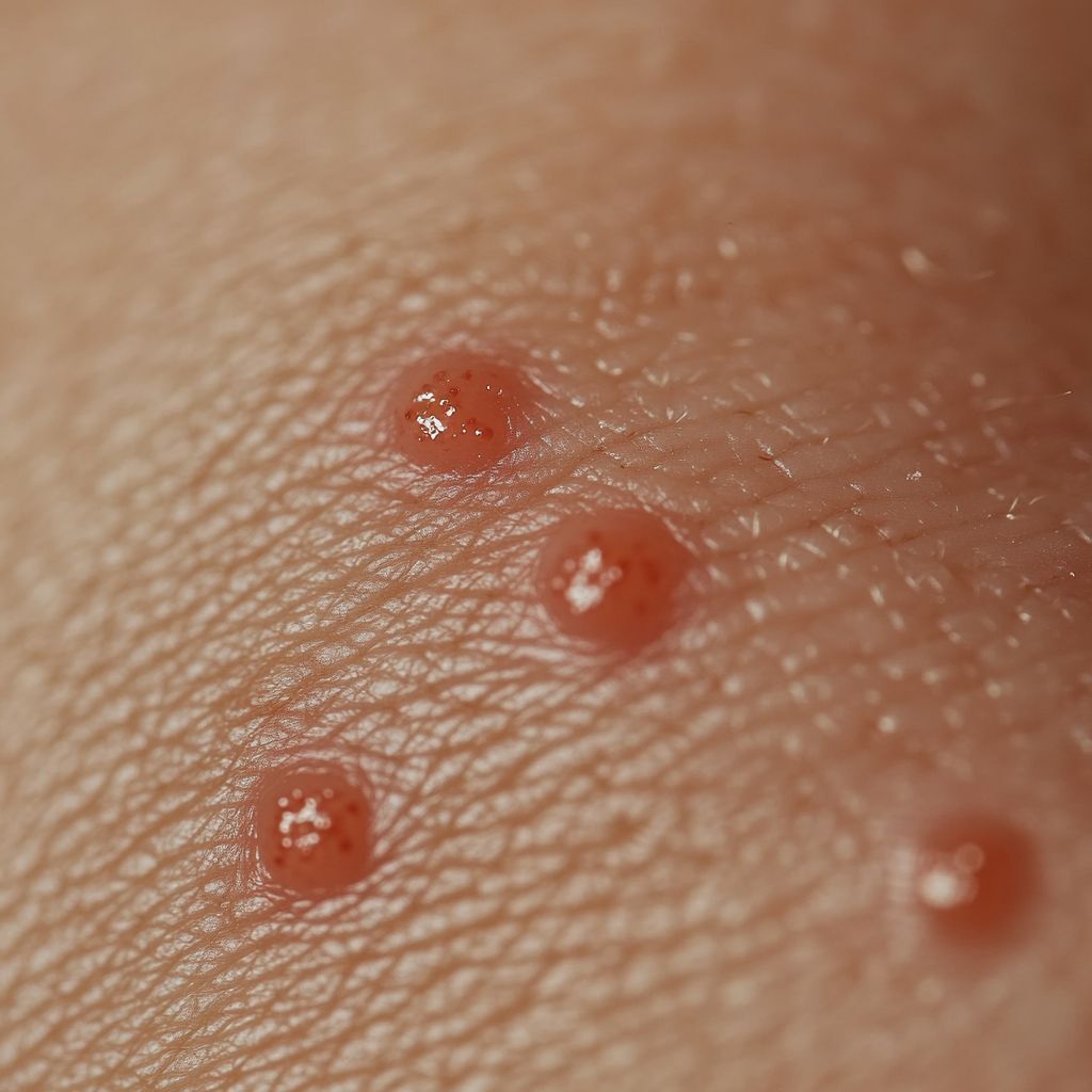 Flohbiss: Flöhe beissen oft in Gruppen oder Reihen, besonders an den Beinen, Knöcheln und Füssen. Die Bisse sind klein, rot und verursachen intensiven Juckreiz. Sie können sekundäre Infektionen hervorrufen, wenn sie aufgekratzt werden.