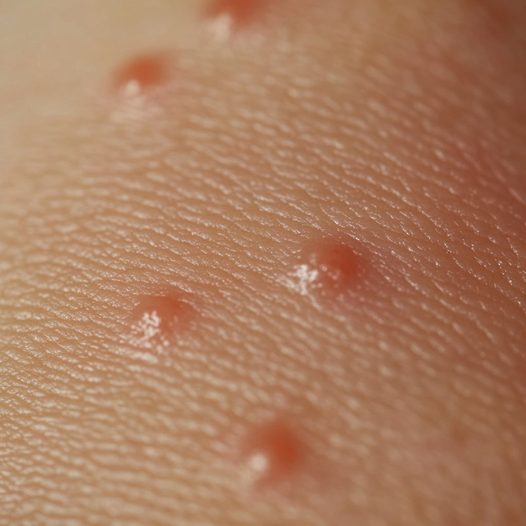 Mückenstich: Mückenstiche verursachen sofortige Schwellungen mit einem roten Punkt in der Mitte. Der Juckreiz tritt schnell ein, ist aber meist nur kurzzeitig. Mückenstiche sind einzeln und nicht in Gruppen angeordnet.