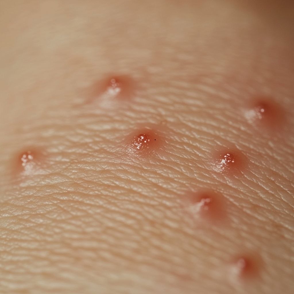 Flohbiss: Flöhe beissen oft in Gruppen oder Reihen, besonders an den Beinen, Knöcheln und Füssen. Die Bisse sind klein, rot und verursachen intensiven Juckreiz. Sie können sekundäre Infektionen hervorrufen, wenn sie aufgekratzt werden.