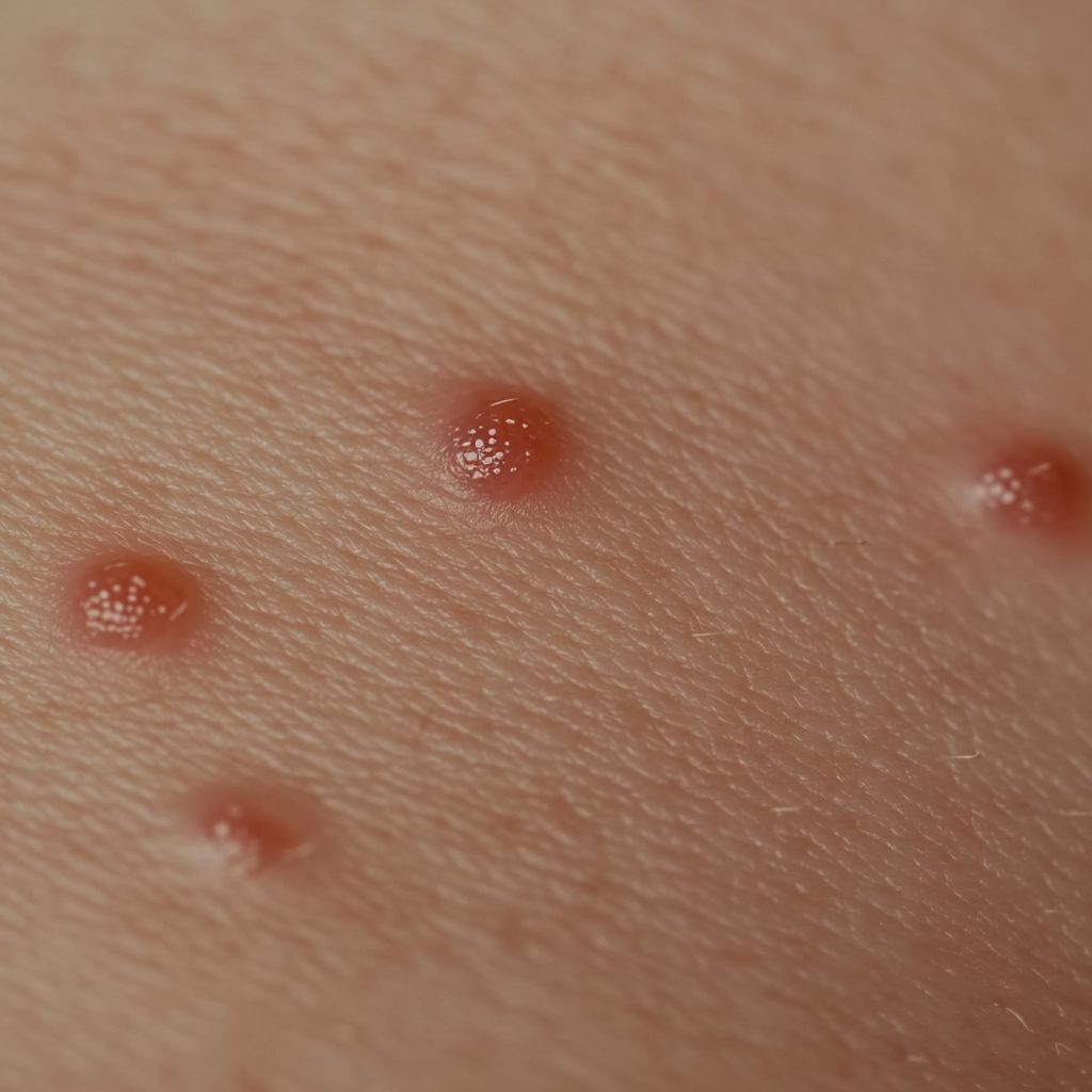 Mückenstich: Mückenstiche verursachen sofortige Schwellungen mit einem roten Punkt in der Mitte. Der Juckreiz tritt schnell ein, ist aber meist nur kurzzeitig. Mückenstiche sind einzeln und nicht in Gruppen angeordnet.