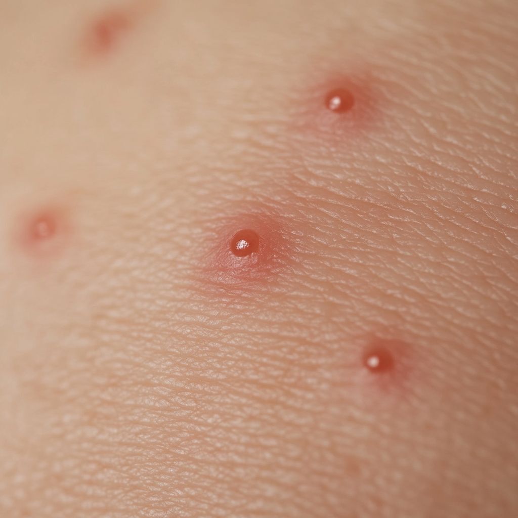 Flohbiss: Flöhe beissen oft in Gruppen oder Reihen, besonders an den Beinen, Knöcheln und Füssen. Die Bisse sind klein, rot und verursachen intensiven Juckreiz. Sie können sekundäre Infektionen hervorrufen, wenn sie aufgekratzt werden.