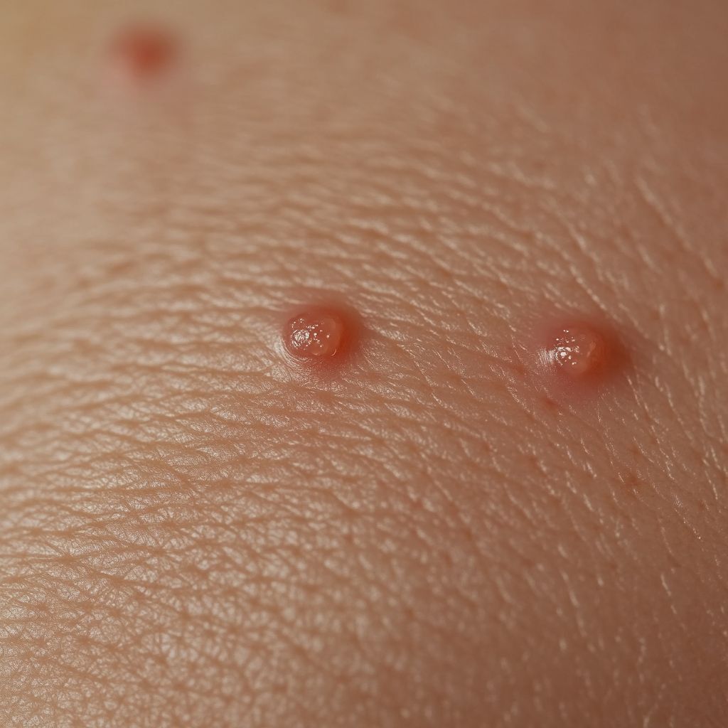 Mückenstich: Mückenstiche verursachen sofortige Schwellungen mit einem roten Punkt in der Mitte. Der Juckreiz tritt schnell ein, ist aber meist nur kurzzeitig. Mückenstiche sind einzeln und nicht in Gruppen angeordnet.
