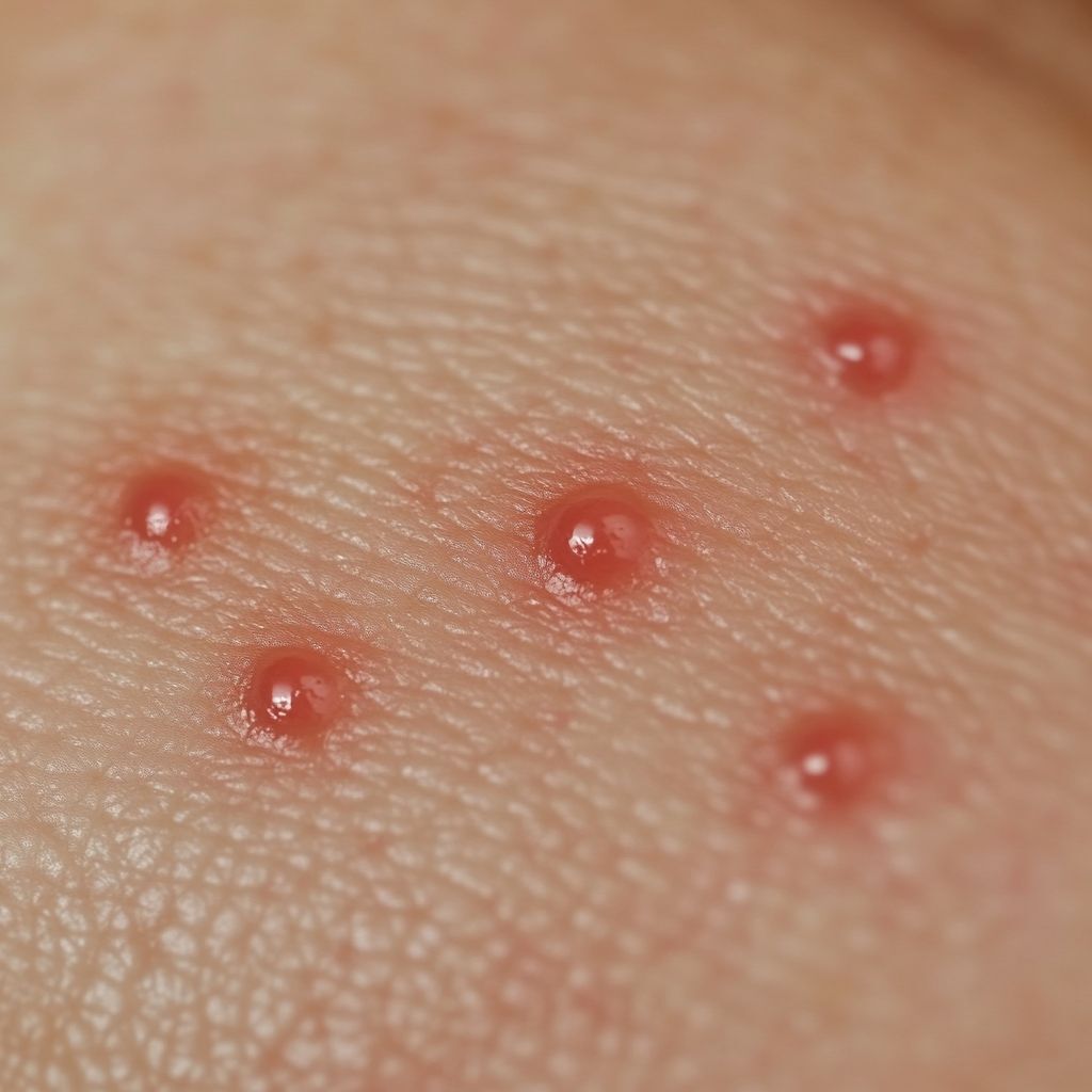 Mückenstich: Mückenstiche verursachen sofortige Schwellungen mit einem roten Punkt in der Mitte. Der Juckreiz tritt schnell ein, ist aber meist nur kurzzeitig. Mückenstiche sind einzeln und nicht in Gruppen angeordnet.